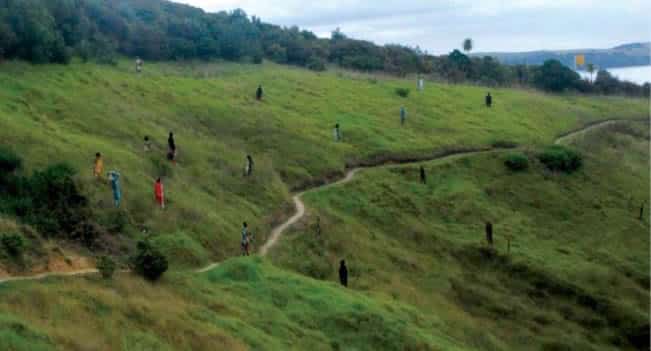 Barebottomland will strike a chord with those who loved Spike Milligan’s classic book and radio story Bad Jelly the Witch, in which Dulboot the giant runs away with a bare bottom after dinglemouse nibbles through his trouser belt. Christian Nicolson asks: “Where is bare bottom land? And who goes there? What do people do there? Do they play tennis or volleyball or drive cars, go swimming and have fish and chips like the rest of us? The series of life-sized figures in Barebottomland are on flat laminated wood but screen printed to create the illusion of three dimensions. And although inspired by a story, the sculptures are ultimately th basis of a study of the naked form and an exporation of our prudishness as a species and our reluctance to show our bodies in public. As featured in The Guardian